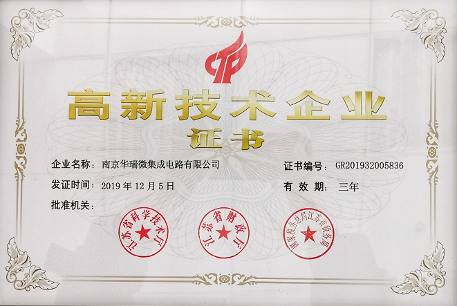 2019年12月,在公司成立的第19個月,華瑞微通過了國家稅務(wù)總局江蘇省財務(wù)局、江蘇科學(xué)技術(shù)廳、江蘇省財政廳組織的國家高新技術(shù)企業(yè)認定(證書編號:GR201932005836),并榮獲“國家高新技術(shù)企業(yè)”稱號,由此正式邁入國家高新技術(shù)企業(yè)行列。