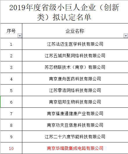 2019年12月3日至2019年12月9日,江蘇省工業(yè)和信息化廳公示了2019年度江蘇省級(jí)專(zhuān)精特新小巨人的擬認(rèn)定名單,南京共有37家企業(yè)入圍。南京華瑞微集成電路有限公司有幸入圍2019年度省級(jí)小巨人企業(yè)(創(chuàng)新類(lèi))擬認(rèn)定名單!